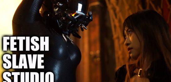 十字架に磔にされているエナメルキャットスーツ姿の熟女。手首・胴体・足首は鎖で完全